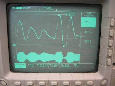 2. There is a bit of audio roll-off from about 1.5 KHz (down 1 dB from 1 KHz) to 5 KHz (down 3 dB from 1 KHz). The first place this roll-off appears is at the plate of the second 12AX7 stage (yet it looks fine at this stage's input grid). I've yet to identify the cause -- I suspect it might be roll-off caused by the RC network formed by the AUDIO pot and the 12AX7 grid capacitance at pin 2, but...