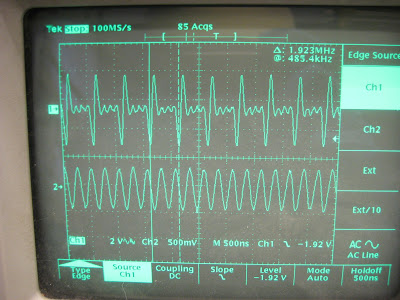 1. Oscillator: the 1.8 MHz fundamental at the plate of the oscillator 6AU6 (that's later doubled to provide the 80 meter signal) looks terrible, as can be seen in the top trace below (the bottom trace is the RF output (sampled via an attenuator)):