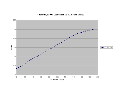 5. Here's a transfer curve that I've made, using my Cheyenne transmitter, showing RF output voltage (attenuated by my RF "sampler") versus PA Screen Voltage (note: I'm using a 6293 tube in lieu of a 6146). Test conditions: PHONE mode, 80 meters, no modulation.