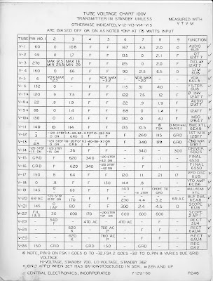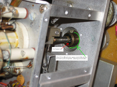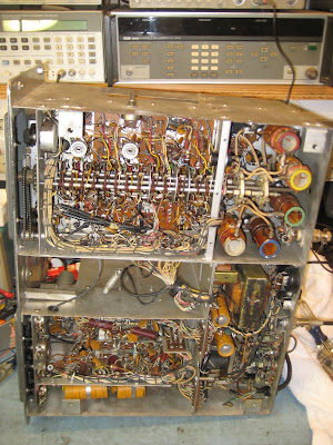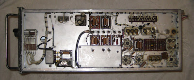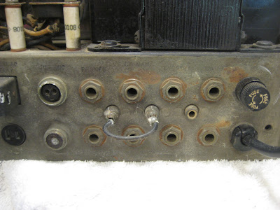 OK, the only documentation I had was a schematic that I downloaded from the web (see "Resource" section, below). The radio had no dynamotor, but the previous owner had brought B+ out to pin 18 of the rear connector. So I attached a 220 volt supply between pins 18 and 9 of the rear connector ("plus" to pin 18), and 26.5 volts between pins 17 and 9 ("plus" to pin 17). I attached a pair of headphones and an antenna, then switched on the power supplies, turned on the radio's front-panel switch, and...