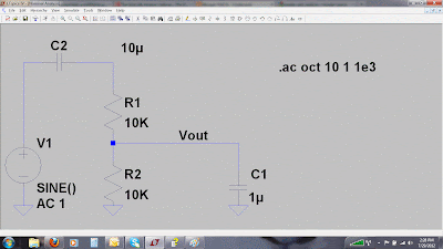 Given these component values, a frequency sweep of the input from 1 Hz to 1KHz shows that the circuit has the following gain and phase transfer function when measured at its Vout node: