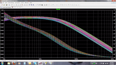 Note the discrete intervals between plots. This is because the worst-case analysis is only using component values that are at the +/- tolerance limits for each component, and not any intermediary values (except for the first of the 40 plots, which uses the nominal component values for its analysis).