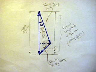 Changing the position of the Neck strap button will change the angle "alpha" shown above. As the neck button moves towards the center of mass, the angle alpha becomes smaller and smaller. Assuming the angle of the Bridge strap doesn't change when we move the neck button (it does, but let's not worry about that), this means that the vertical component of "Tension, Neck Strap" increases (and therefore the vertical component of "Tension, Bridge Strap" must decrease, because they both must still add up to be the weight of the guitar, which itself is unchanging). That is, as I move the neck button in towards the body of the guitar (and its center of mass), the "Tension, Neck Strap" vector's point moves down along the vector I've drawn for "Tension, Bridge Strap".