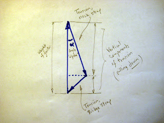 Note how the vertical component of the Tension, Neck Strap, has increased while the vertical component of the Tension, Bridge Strap has decreased by an equal amount.