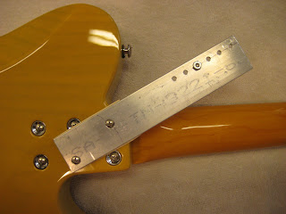 I played around with the location of the strap button and decided that I liked it best near the 13th fret -- As the button is moved further out from the body towards the neck the guitar body will shift in the opposite direction. I decided that I didn't like the way the tummy cutout was hitting me when the button was at its furthest location, and that a good compromise was with the button near the 13th fret.
