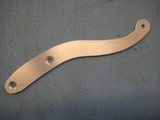 I dropped by a local surplus-metals shop and had them cut me some 8 inch long pieces of 6061-T6511 aluminum flat bar stock (0.125" thick by 1.5" wide). I drilled a hole in the lower corner of one of them, mounted it to the lower-middle neck mounting hole shown above, and rotated the bar about this mounting point until I had it in a position that seemed good.