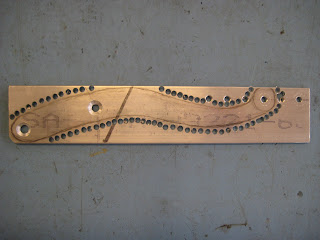 Once the bar's position seemed good (I wanted to try mounting the button above the 12th fret and at the same height that the button was currently mounted), I then determined where I wanted to place the second mounting hole. After drilling it, I also drilled some holes for experimentation with the strap-button placement (to give me a range of choices to play around with).