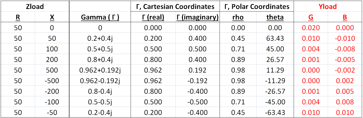 The first thing you should note: although R = 50 for all nine values, G is not constant. But take a look at G when Zload = 50 + j0 (our ideal match). It's equal to 0.02 Siemens.