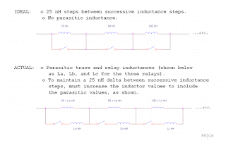 The relays and the interconnecting wires (or PCB traces) each have their own inductances (parasitic). To maintain my goal of a 25 nH step between successive inductance steps, I need to account for these parasitic inductances, otherwise I will have varying inductance deltas as I successively step through the values.