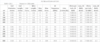 Note, too, that the 800 nH coil is calculated at 24.9 MHz (the highest frequency it's used for matching a 10:1 SWR), but I used the skin-effect resistance (ohms per foot) for 30 MHz.