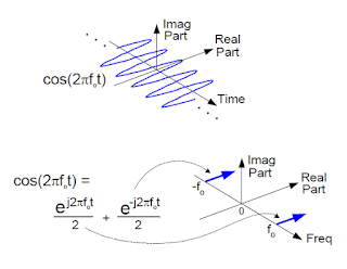 Second, we can use both of these illustrations of the signals in the complex frequency-domain to generate a visual representation of Euler's Formula, showing how the imaginary sine terms are rotated (when multiplied by j) to the real axis and then added to the real cosine terms: