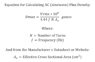 Note that Vmax and i1 in the equations above should be RMS values when calculating heating flux-density and peak-voltage values (i.e. 1.414 times the RMS value) when calculating saturation flux-density.