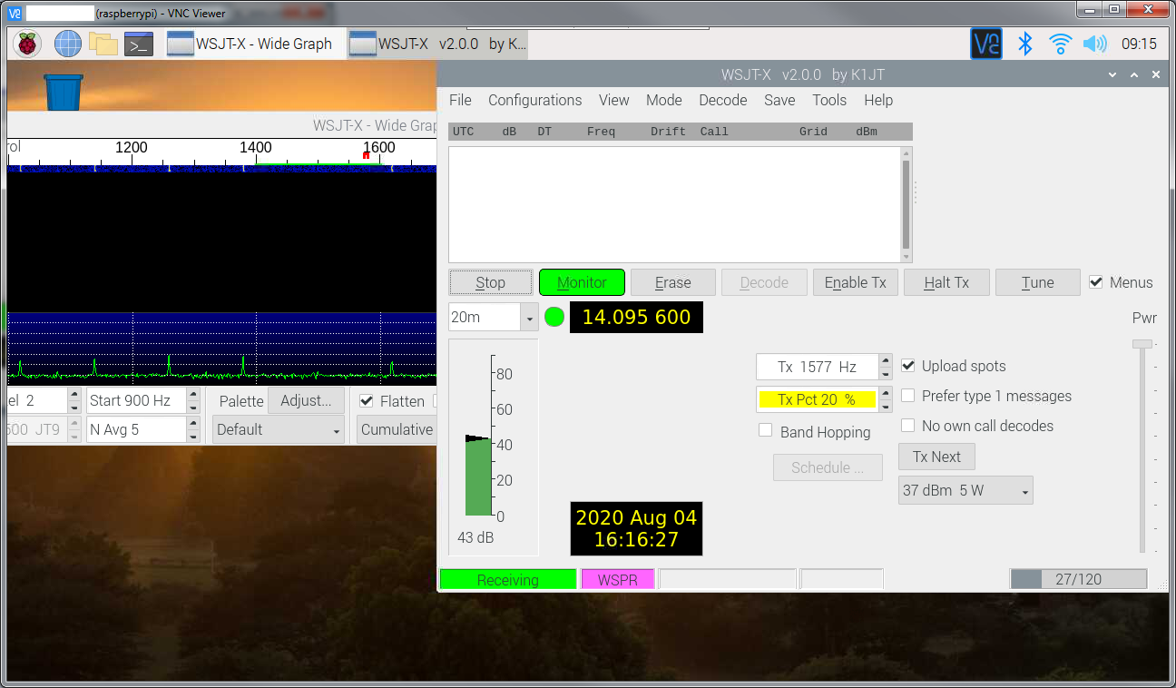 2. There seems to be a significant delay (on the order of seconds) in the actual engagement of the FT-1000D's PTT when controlled via CAT and the Raspberry Pi from "VNC Viewer" on my laptop. I especially notice this delay if I toggle the "Tune" button on the WSJT-X control panel. It seems like the actual toggling of the PTT state at the transceiver is delayed by 2 to 4 seconds from the moment I click on the "Tune" button, which I find quite noticable.