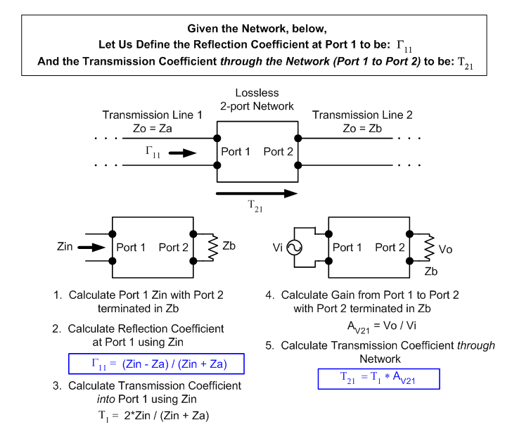 2. For Reflection and Transmission Coefficients from the network's Port 2 to its Port 1 (in other words, in the opposite direction), use the same technique. Note that the impedance (Zin) looking into the network's output (Port 2) equals Zc || (Zl + Za), where Za is the impedance of the transmission line connected to Port 1, and AV12 (the voltage gain from Port 2 to Port 1) = Za / (Za + Zl).