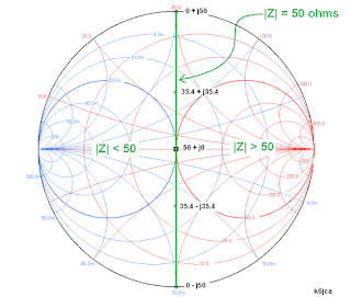 The vertical green line drawn on the Smith Chart below identifies the loads whose impedance magnitude is 50 ohms.