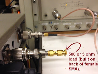 But I prefer to use the VNA to measure the load's actual S11 characteristics for the frequency range of interest. Below is my 5 ohm Test Load attached to Port 1 of the S-Parameter Test Set:
