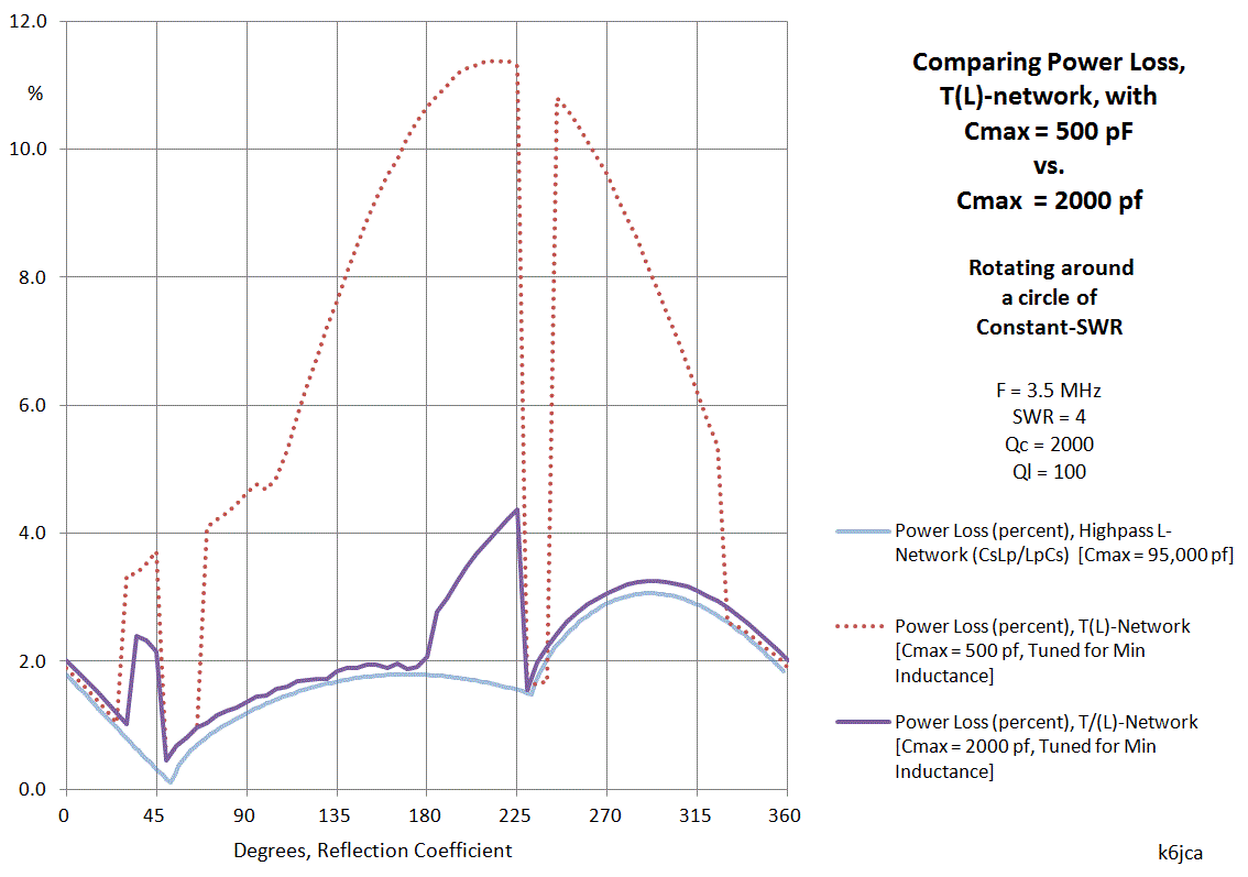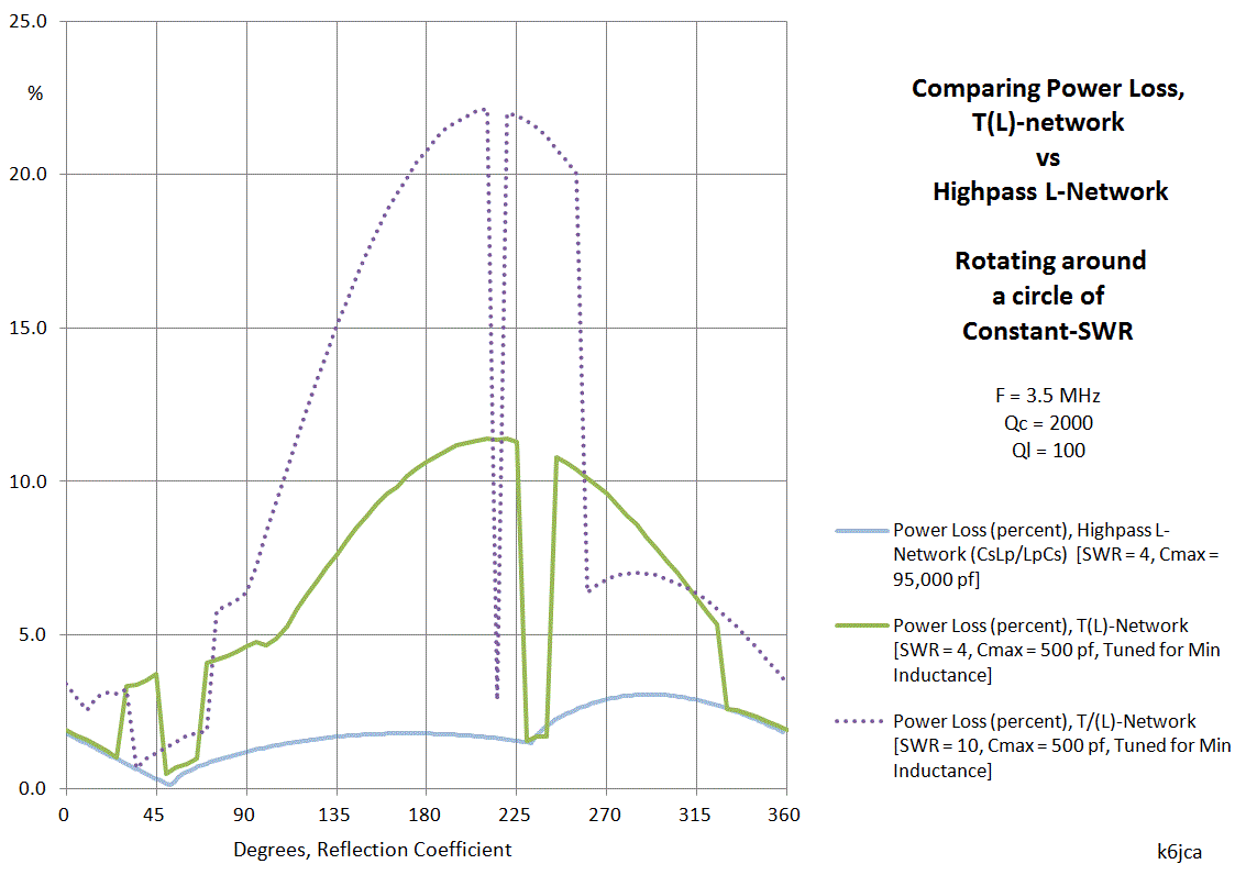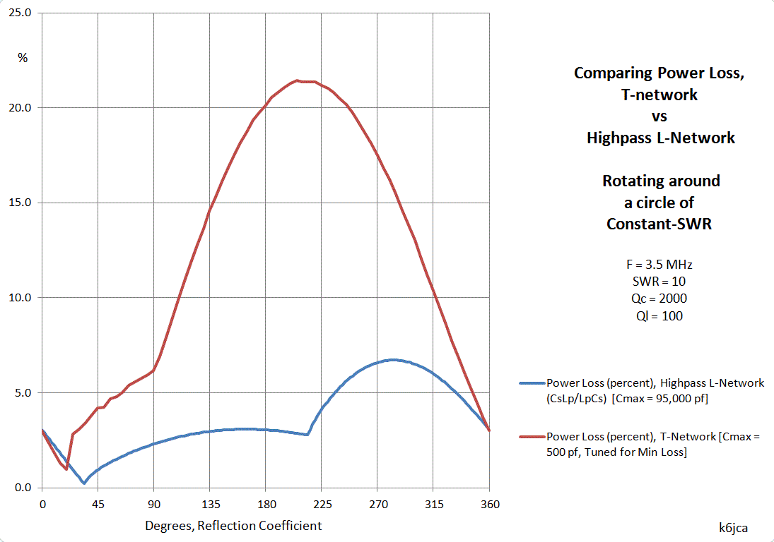 So, although the T-network now lets us match all of the load values with reasonable component values, the tradeoff is the significantly increased power dissipation in the T-network (which peaks between 20 and 25% in the graph above).