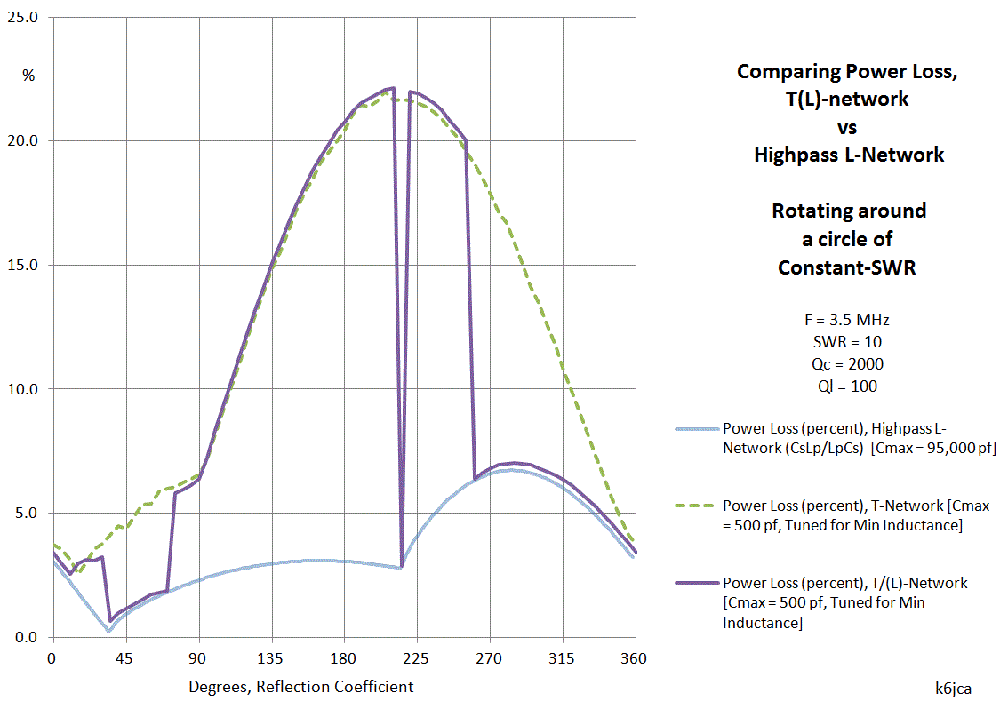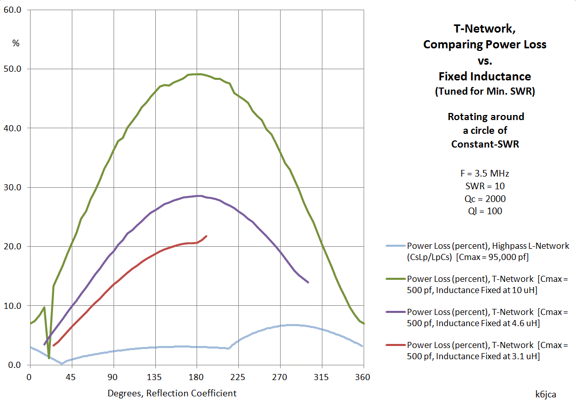 Some authors claim that when a T-network has been tuned for a 1:1 SWR with minimum inductance, this point also corresponds to minimum loss. This is not true, and you can prove it using W9CF's on-line T-Network Tuner Simulator.