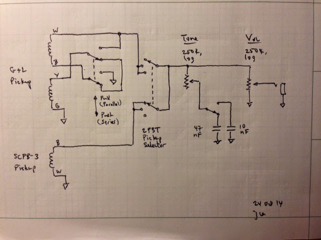 And after playing around with the cap values, I decided to decrease the number from 5 caps to 2: 10nF and 47nF. One of the push-pull switches will select the cap value. And I changed the 5-position selector switch to a standard 3-position pickup selector, as shown in the schematic below: