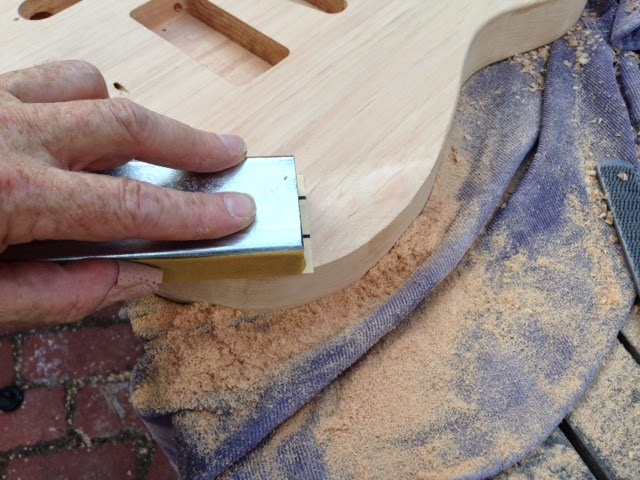 With all of the wet sanding, it's important to keep the water away from the wood, otherwise the wood will absorb it and swell. In the first two bodies I'd painted (kit-bass bodies), I had this problem, and I thought I'd solved it this time by plugging the few holes I had with wax. And this worked well. But I'd removed the tape I'd used to mask off the neck pocket, revealing bare wood next to the edge of the paint, and a small amount of water was absorbed there, swelling the wood in a few places under the paint.