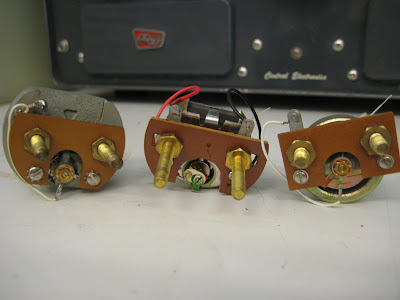 Another problem I discovered was that the three 4.7 Mohm, 2 Watt resistors (R6, R7, and R8) used to divide down the Plate Voltage (for the Plate Voltage meter) were all bad (one was open, one read 20 Mohms, and the third read 6 Mohms on my DVM). Per other reports on the web, failures such as this were due to the resistors being greatly overstressed (they're each subject to somewhere in the range of 750 to 1000 volts, and (allegedly) the original resistors were only rated at 350 working-volts dc). Unfortunately, didn't have any resistors with a high enough working voltage spec in my junkbox.