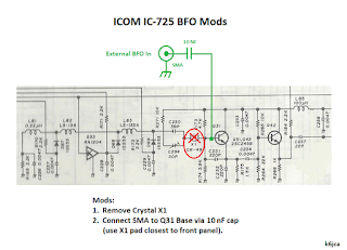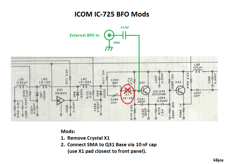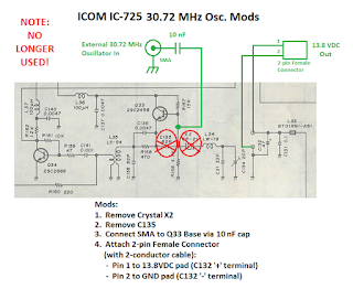 Hardware modifications to the IC-725's 30.72 MHz Oscillator circuit are: