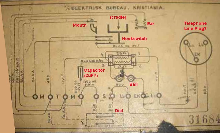 According to the book Telefonappater i Norge 1880-2000 page 62, this telephone was manufactured by Elektrisk Bureau from 1921-1924. This book was published (in Norwegian) by Norsk Telemuseum, Oslo in 2000. It describes the telephones in that museum which my wife and I had the opportunity to visit several years ago. I bought a copy of this book at the museum during that visit.And here's a schematic from a different Elektrisk Bureau phone (original photo taken by Harry Smith and posted here on the TCI photo site. I've used Photoshop to do some keystone correction of Harry's photo, and I've also added some annotation to clarify some of the original schematic symbols).