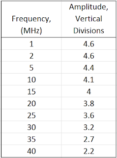 Using my HP 3335 signal generator set to +10 dBm and feeding the scope directly via a length of coax (terminated in 50 ohms at the scope input), I measured the following frequency response. Note, the amplitude measurement is in vertical division of the scope's CRT.