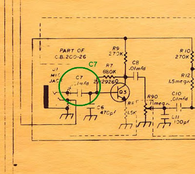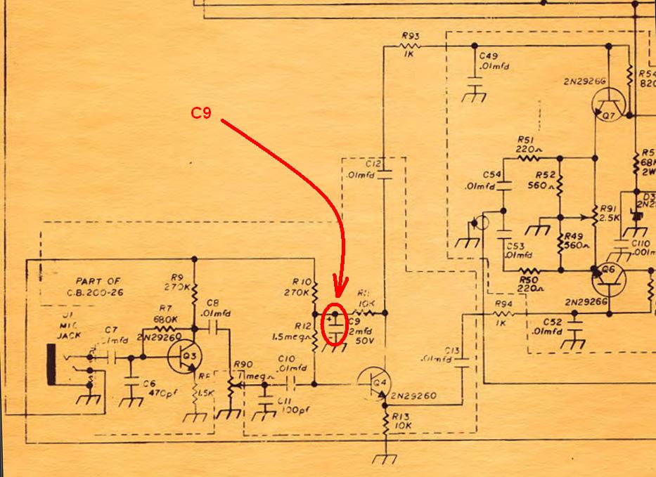 - Very low TX audio. I traced this to a faulty R9 (270K, 1/2 watt) in the Mic Preamp circuit (it read infinite ohms with an ohmmeter). Replaced with same value resistor.