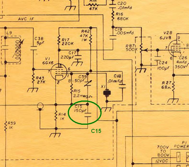 - Very little gain on receive. I traced this to R46 (47K, 1W plate-load for V7b) reading infinite ohms. Replaced with a 47K, 2W resistor from my junk-box.