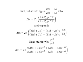 This blog post shows how the tanh() form of the equation for Zin, the input impedance of a terminated lossy transmission line, can be derived from the complex-exponential equation.